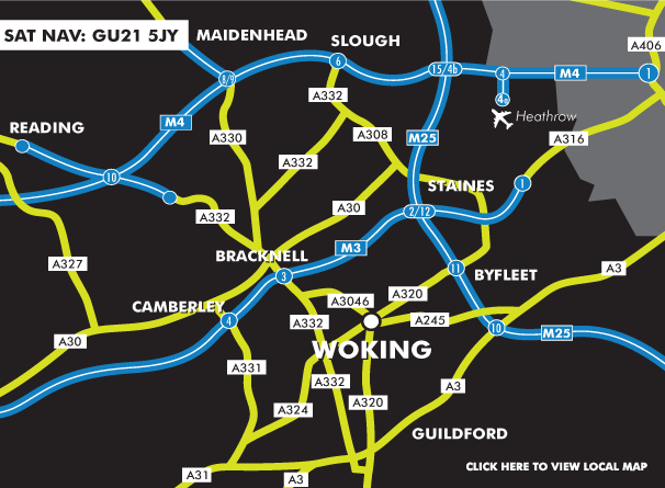 Woking boasts excellent road communications with easy access to the national motorway network. The town lies approximately 5 miles from junction 11 of the M25, 8 miles from junction 3 of the M3 and 5 miles from the A3.